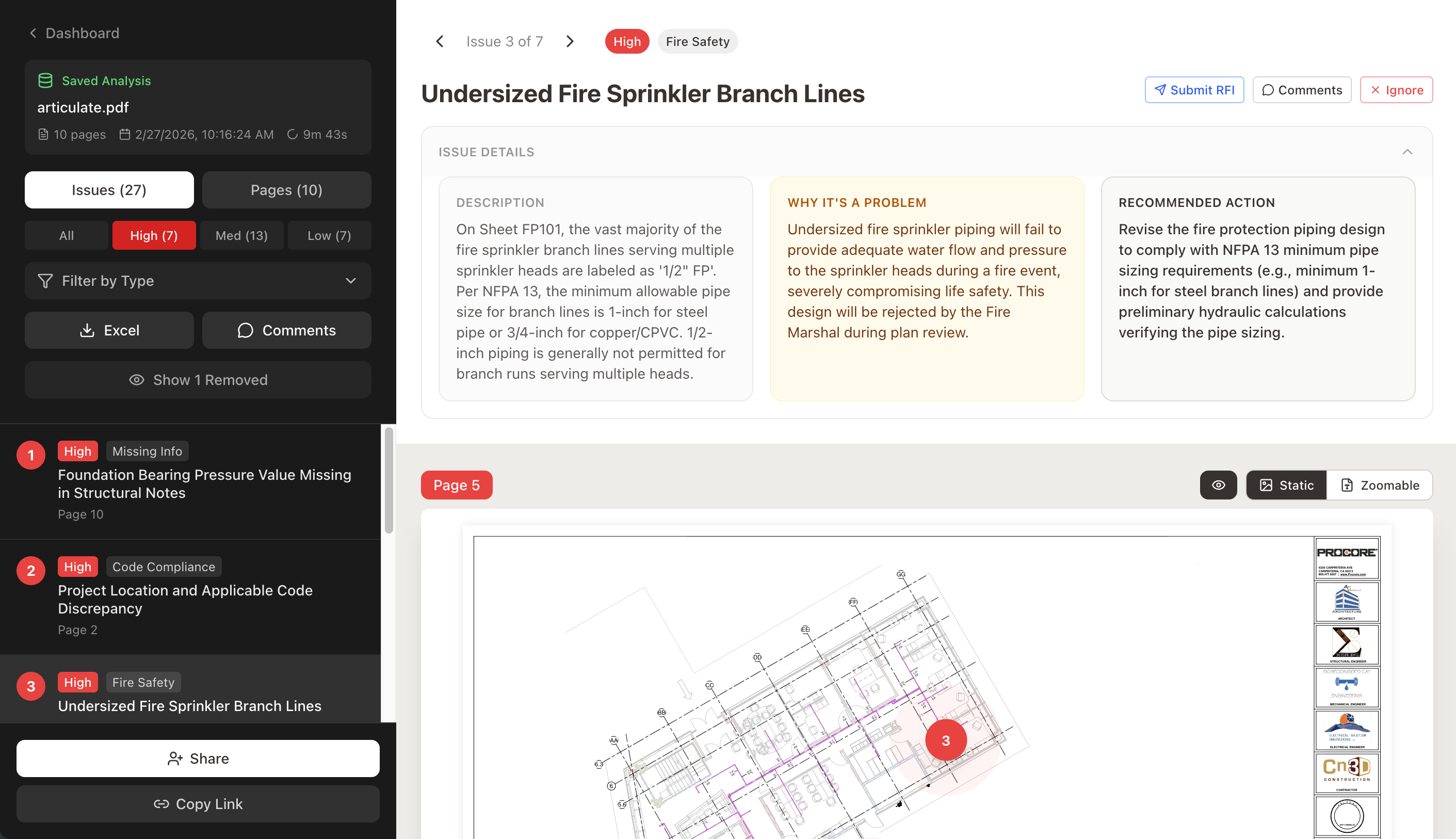 Upload your PDF drawings and our proprietary AI — trained specifically on construction drawings — analyzes every page for coordination conflicts, code compliance issues, structural concerns, MEP clashes, and 6 other categories. Issues are returned with precise page locations, severity ratings, and detailed descriptions.